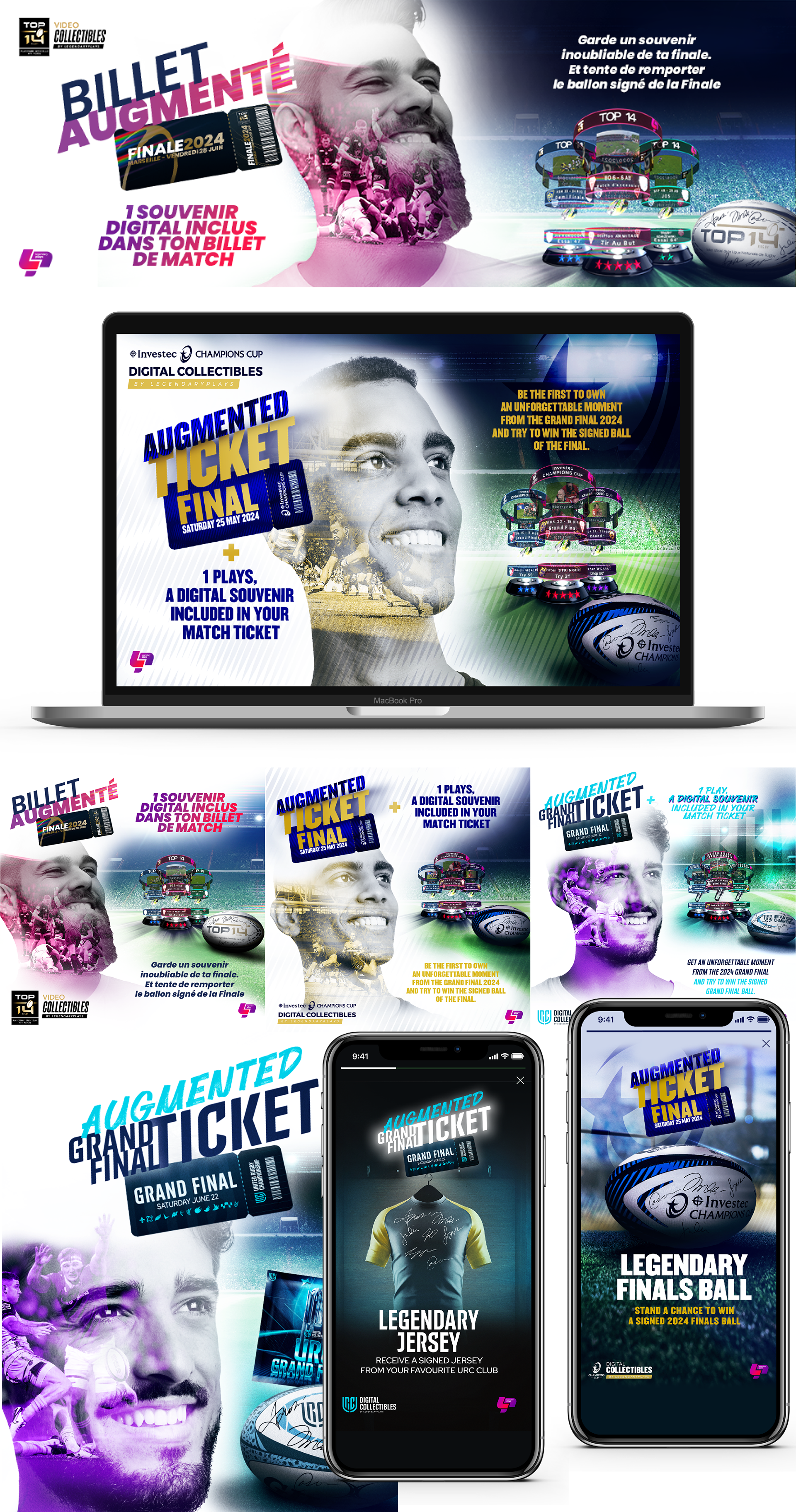 Création d'une campagne digital appelé "Billet Augmenté". Pour les Finales du TOP14, de l'URC et de l'EPCR. • Mission : Identité visuelle + Déclinaisons digitales