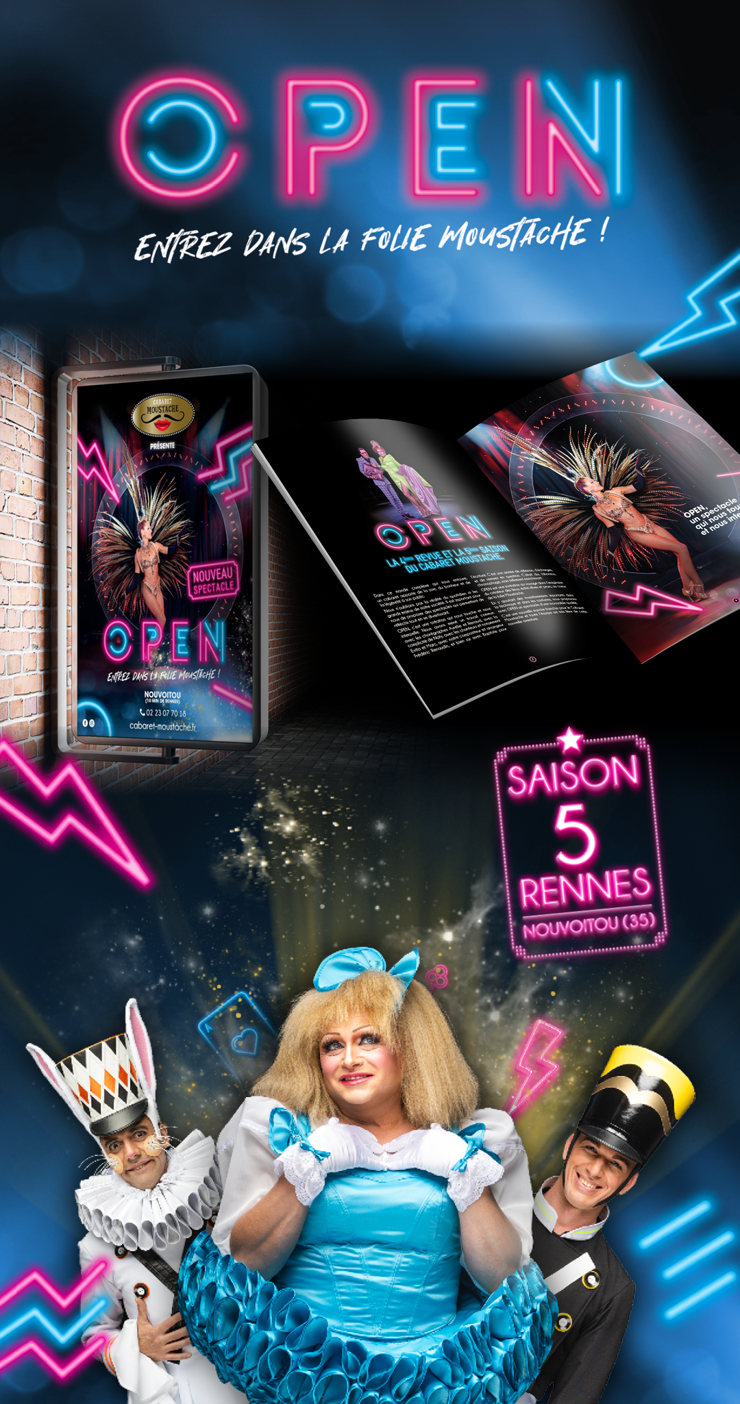 Création de l’identité visuelle de la revue Open, pour le Cabaret Moustache ! • Mission : Identité visuelle + Déclinaisons print / digitales